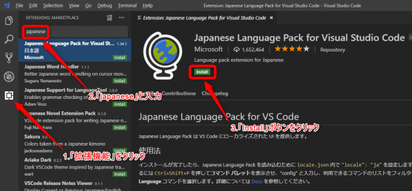 - 下に表示された「Japanese Language Pack for Visual Studio Code」をクリックし,右の窓に現れた説明から「インストール」をクリック